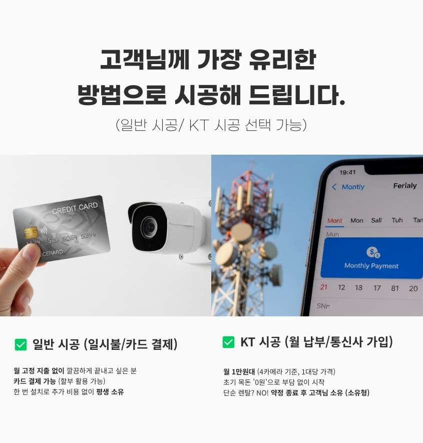 반대로 “나는 나중에라도 매달 통장에서 꼬박꼬박 요금 나가는 게 세상에서 제일 싫다” 하시는 분들도 계십니다. 이런 실속파 분들께는 설치할 때 비용을 한 번에 결제하는 일반 시공(일시불 및 카드 결제)이 정답입니다. 씨씨티비설치 초기에 모든 비용을 완납하기 때문에, 나중에는 약정 기간에 신경 쓸 필요도 없고 매달 통장에서 요금이 빠져나가는 스트레스도 전혀 없습니다. 5년, 10년 길게 내다본다면 내 주머니에서 나가는 전체 비용을 가장 많이 아껴주는 가장 확실한 방법입니다.