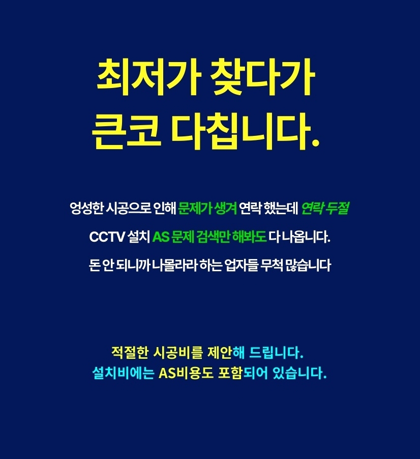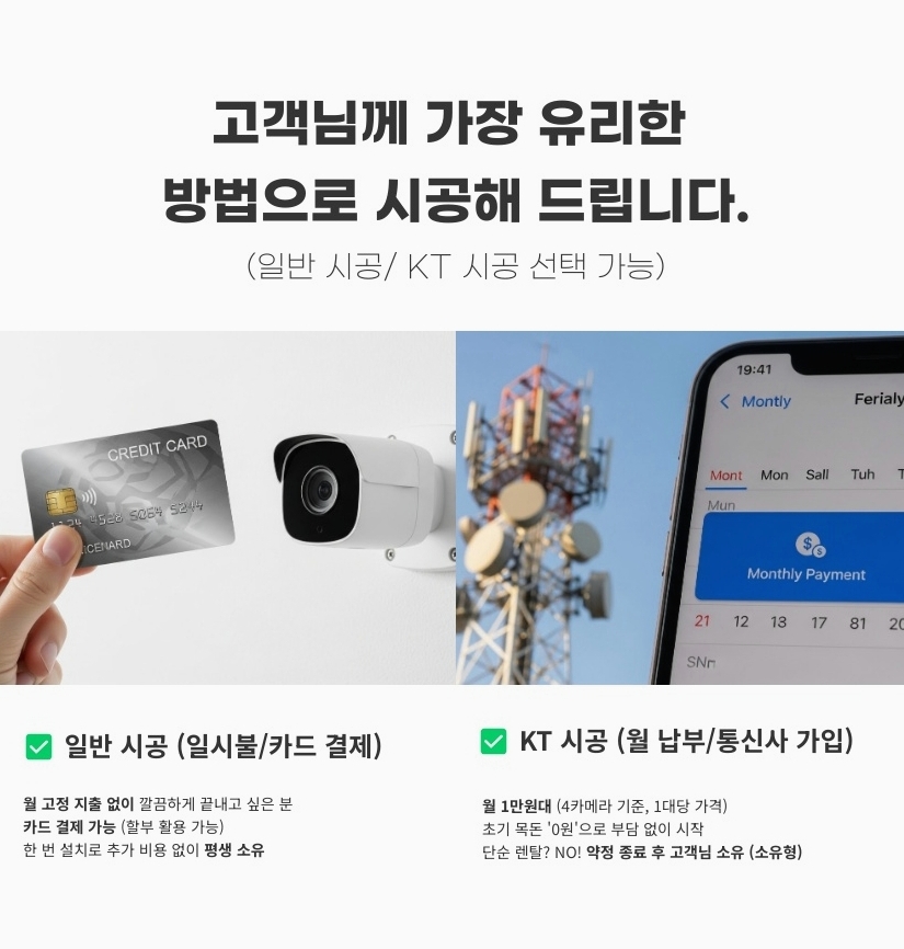 반대로 “나는 나중에라도 매달 꼬박꼬박 요금 나가는 게 세상에서 제일 싫다” 하시는 분들도 계십니다. 이런 실속파 분들께는 설치할 때 비용을 한 번에 결제하는 일반 시공(일시불 및 카드 결제)이 정답입니다. 씨씨티비설치 초기에 비용을 모두 완납하기 때문에, 나중에는 약정 기간에 신경 쓸 필요도 없고 매달 통장에서 요금이 빠져나가는 스트레스도 전혀 없습니다. 5년, 10년 길게 내다본다면 내 주머니에서 나가는 전체 비용을 가장 많이 아껴주는 가장 확실한 방법입니다.