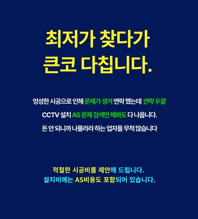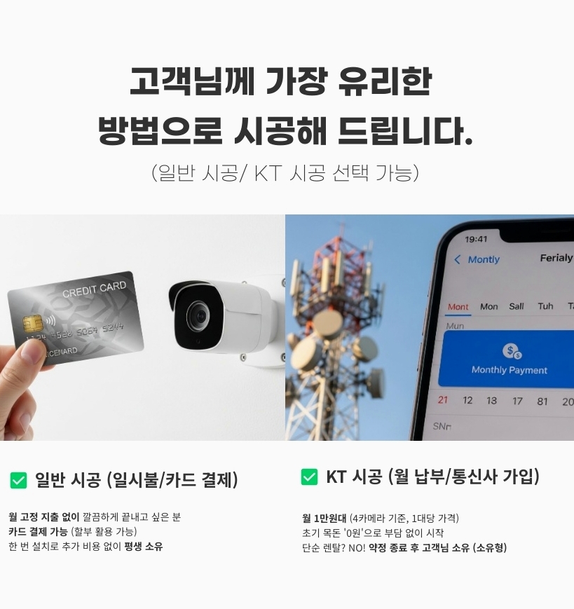 반대로 “나는 나중에라도 매달 꼬박꼬박 통장에서 돈 나가는 게 세상에서 제일 싫다” 하시는 철저한 실속파 분들도 계십니다. 이런 분들께는 설치할 때 비용을 한 번에 결제하는 일반 시공(일시불 및 카드 결제)이 정답입니다. 씨씨티비설치 초기에 모든 비용을 완납하기 때문에, 나중에는 약정 기간에 신경 쓸 필요도 없고 매달 통장에서 요금이 빠져나가는 스트레스도 전혀 없습니다. 5년, 10년 길게 내다본다면 내 주머니에서 나가는 전체 비용을 가장 많이 아껴주는 확실한 방법입니다.