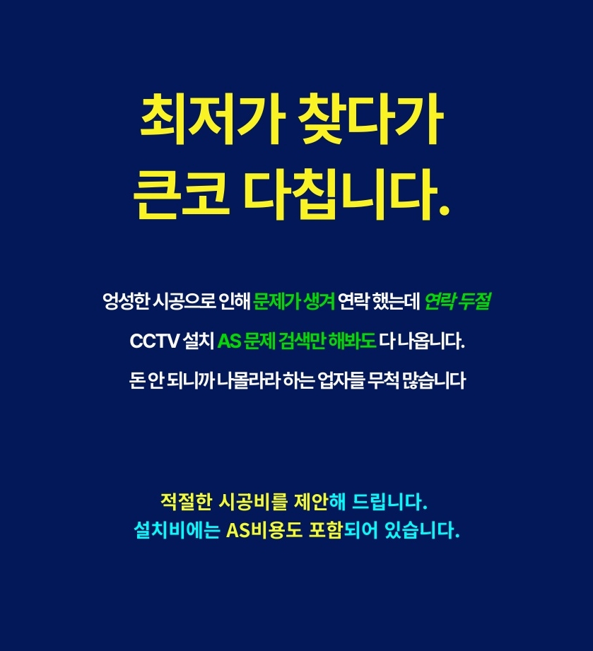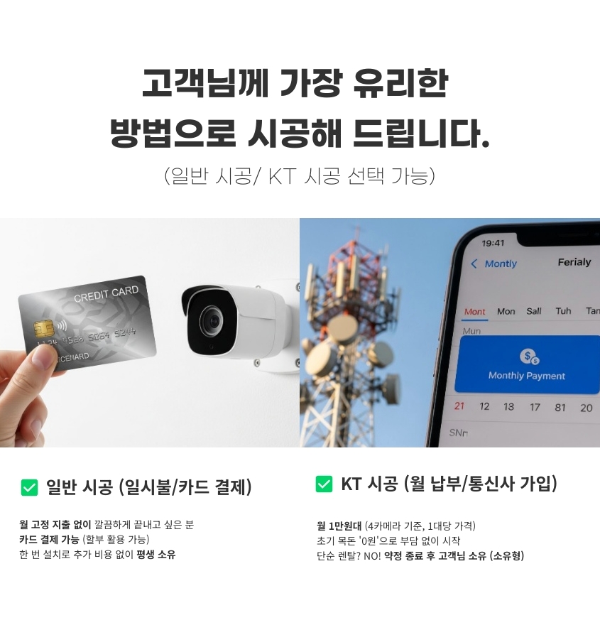 저희 전문 시공팀은 초기 목돈 지출을 우려하시는 고객님들을 위해 카드 결제 시스템을 완벽하게 운영하고 있습니다. 경기도 가평군 행현리 CCTV 설치 상담을 진행하다 보면 일시불의 경제적 이득은 알지만 한 번에 큰 금액을 내는 것에 부담을 느끼는 분들이 계시는데, 이때 카드 결제를 활용하면 할부 등을 통해 부담을 합리적으로 나누면서도 결국 ‘매달 고정비 없는 완전한 내 장비’를 소유할 수 있습니다. 한 번의 투자로 깔끔하게 씨씨티비설치를 마무리하고 장기적인 가성비를 챙기고 싶은 분들에게는 일반 시공이 최고의 정답입니다.