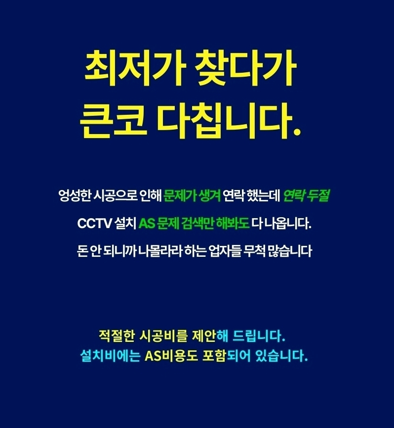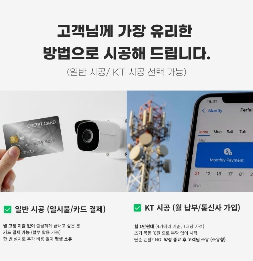 단순히 카메라를 파는 곳은 많습니다. 하지만 강상면의 지형과 기후 특성을 이해하고, 고객님의 경제적 이득까지 고려하여 씨씨티비설치를 진행하는 곳은 흔치 않습니다. 저희는 고객님의 예산과 보안 목적에 맞춰 가장 유리한 선택(KT 결합형 vs 일반 시공형)을 진정성 있게 제안해 드립니다.