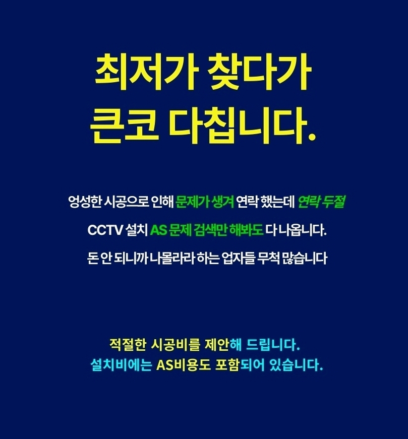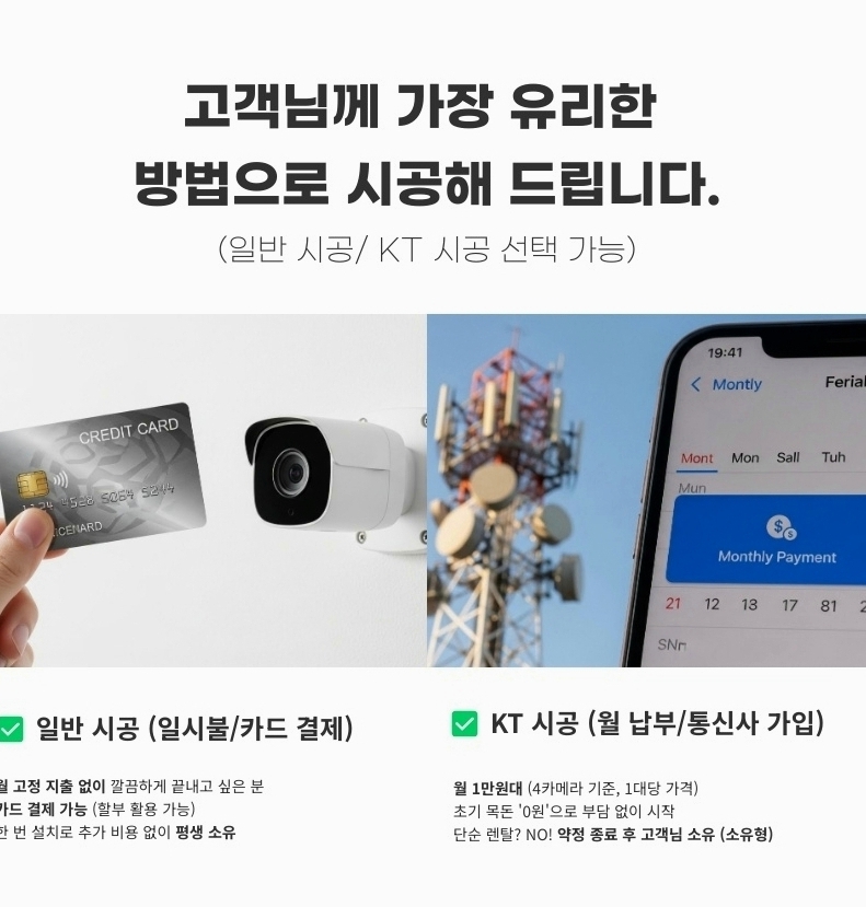 반대로 “나는 나중에라도 매달 통장에서 꼬박꼬박 돈 나가는 게 세상에서 제일 싫다” 하시는 철저한 실속파 분들도 계십니다. 이런 분들께는 설치할 때 비용을 한 번에 결제하는 일반 시공(일시불 및 카드 결제)이 정답입니다. 씨씨티비설치 초기에 모든 비용을 완납하기 때문에, 나중에는 약정 기간에 신경 쓸 필요도 없고 매달 통장에서 요금이 빠져나가는 스트레스도 전혀 없습니다. 5년, 10년 길게 내다본다면 내 주머니에서 나가는 전체 비용을 가장 많이 아껴주는 확실한 방법입니다.