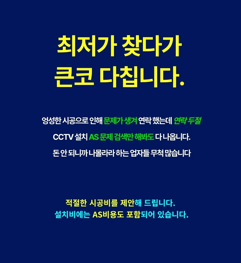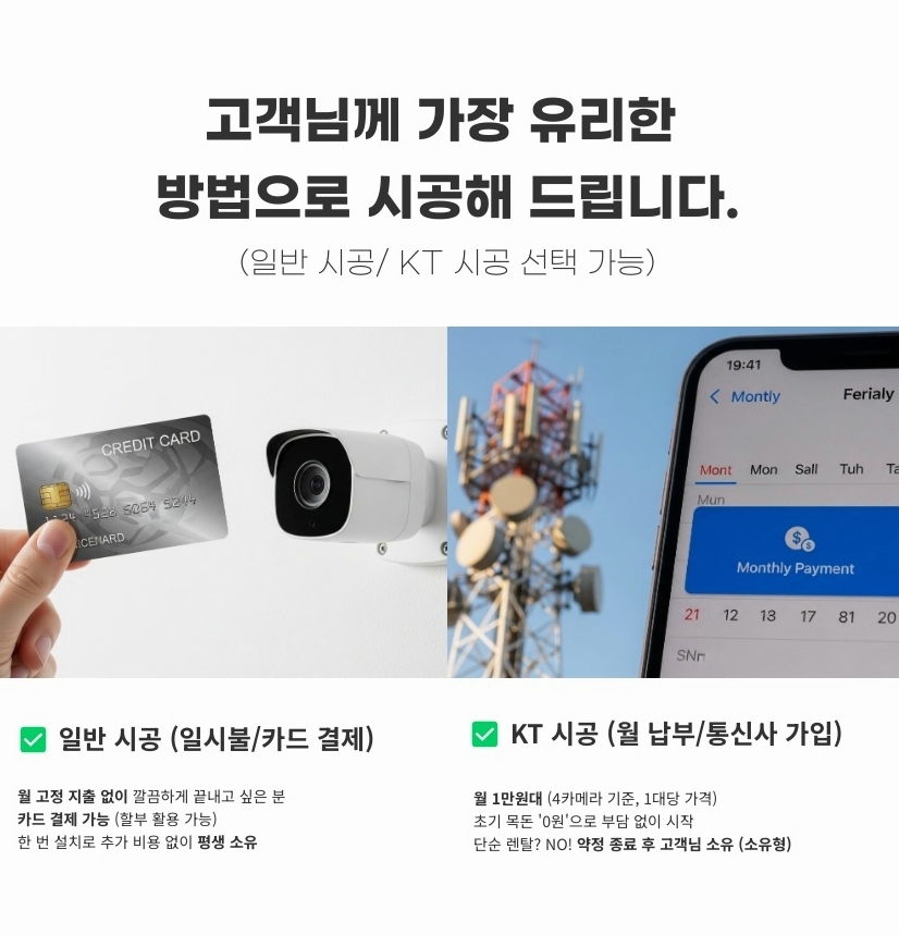 반대로 “나는 나중에라도 매달 통장에서 꼬박꼬박 돈 나가는 게 세상에서 제일 싫다” 하시는 철저한 실속파 분들도 계십니다. 이런 분들께는 설치할 때 비용을 한 번에 결제하는 일반 시공(일시불 및 카드 결제)이 정답입니다. 씨씨티비설치 초기에 모든 비용을 완납하기 때문에, 나중에는 약정 기간에 신경 쓸 필요도 없고 매달 통장에서 요금이 빠져나가는 스트레스도 전혀 없습니다. 5년, 10년 길게 내다본다면 내 주머니에서 나가는 전체 비용을 가장 많이 아껴주는 확실한 방법입니다.