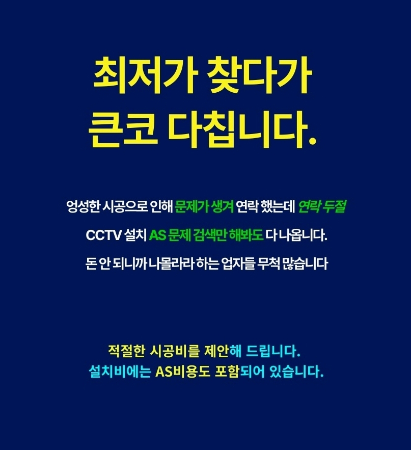 반대로 “나는 나중에라도 매달 통장에서 꼬박꼬박 돈 나가는 게 세상에서 제일 싫다” 하시는 철저한 실속파 분들도 계십니다. 이런 분들께는 설치할 때 비용을 한 번에 결제하는 일반 시공(일시불 및 카드 결제)이 정답입니다. 씨씨티비설치 초기에 모든 비용을 완납하기 때문에, 나중에는 약정 기간에 신경 쓸 필요도 없고 매달 통장에서 요금이 빠져나가는 스트레스도 전혀 없습니다. 5년, 10년 길게 내다본다면 내 주머니에서 나가는 전체 비용을 가장 많이 아껴주는 확실한 방법입니다.